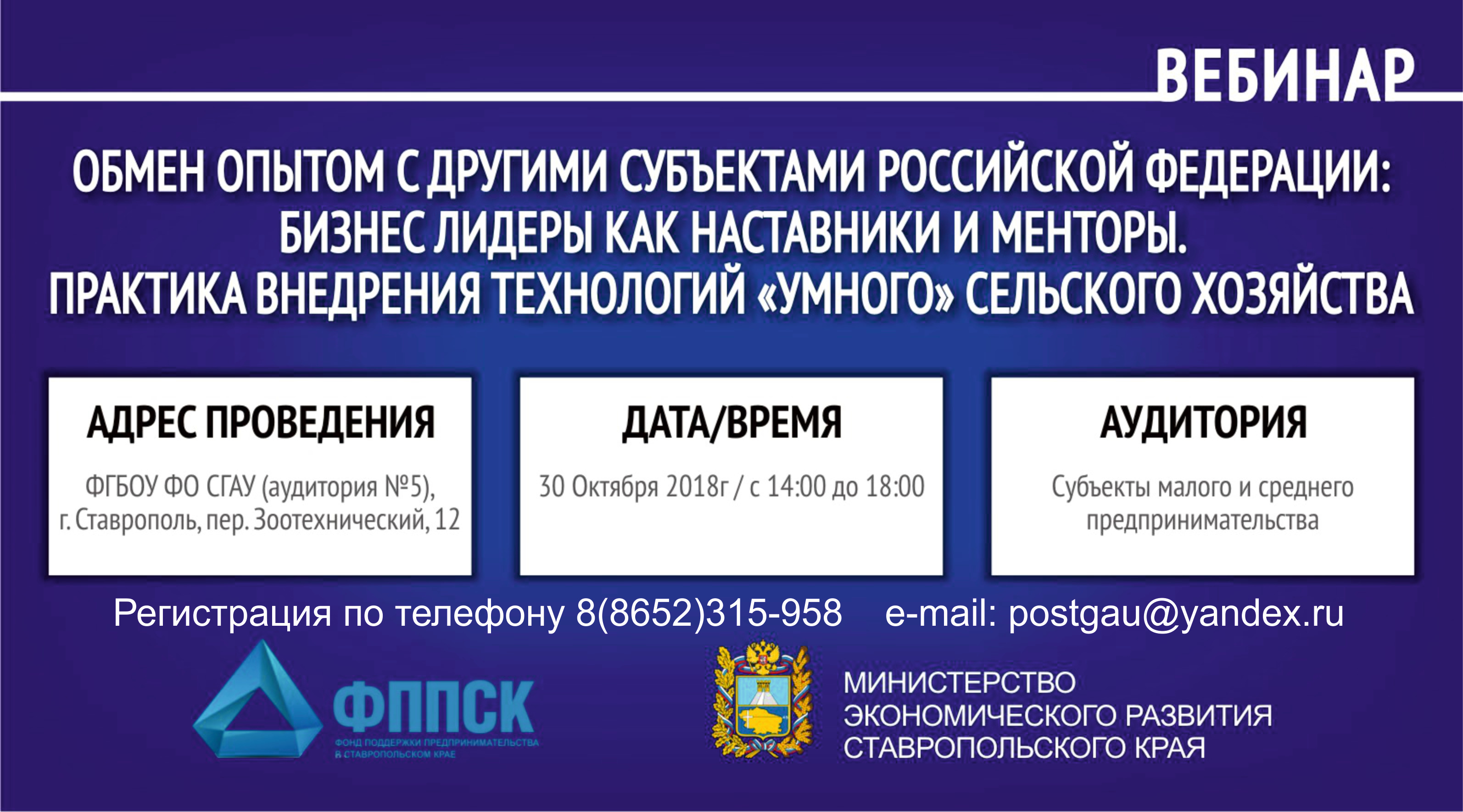 5 апреля 2018 г. прошел вебинар с директором инвестиционно-управляющей группы компаний WIN Corp, Вениамином Кизеевым (г. Томск), в нем приняли участие сотрудники координационного центра по трансформации ФГБОУ ВО Ставропольского ГАУ в центр инновационного и технологического развития Ставропольского края Бобрышев Алексей Николаевич, Письменная Елена Вячеславовна, Аникуев Сергей Викторович, Кенина Диана Сергеевна, декан факультета механизации сельского хозяйства Кулаев Егор Владимирович, начальник отдела НИОКР и трансфера технологий научно-инновационного учебного центра Скляров Сергей Павлович.