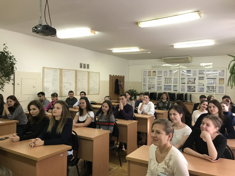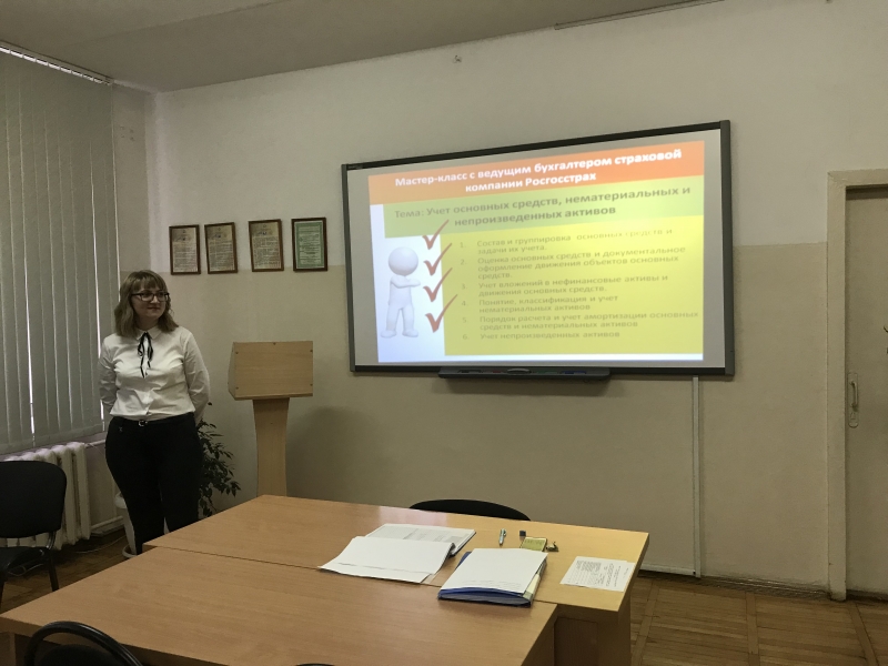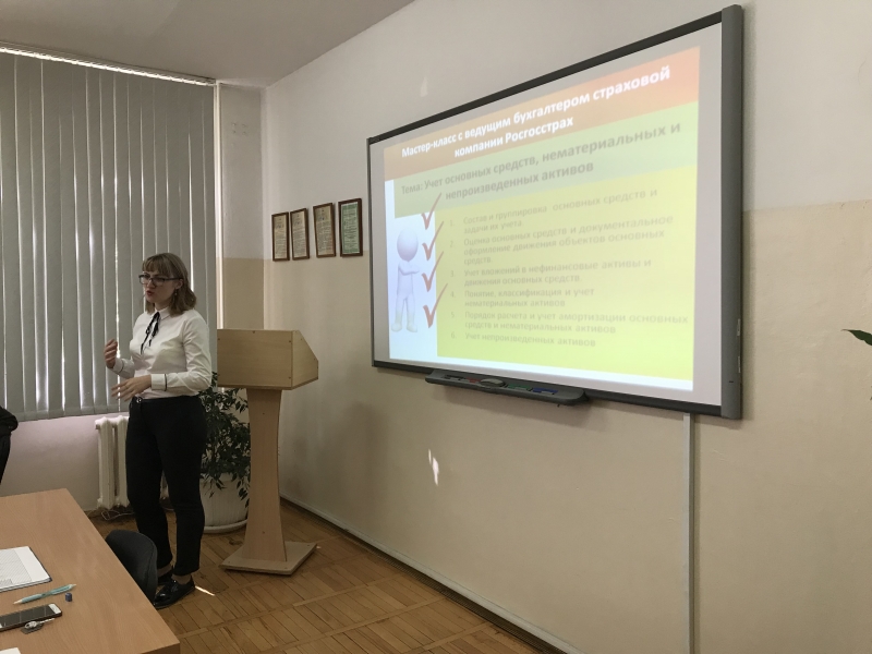 5 октября 2018 года на базе Учебно-практического центра учета, анализа и прогнозирования финансово-хозяйственной деятельности, кафедрой бухгалтерского управленческого учета был организован мастер-класс ведущего бухгалтера ПАО СК «Росгосстрах» в Ставропольском крае Дружининой Марины Юрьевны на тему: «Опыт формирования профессиональной компетенции бухгалтера».
