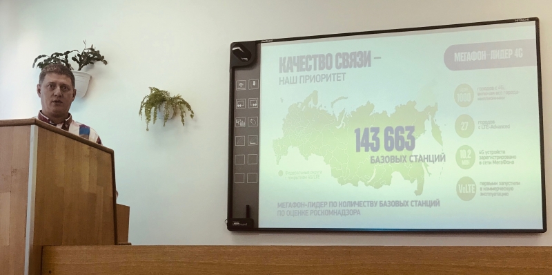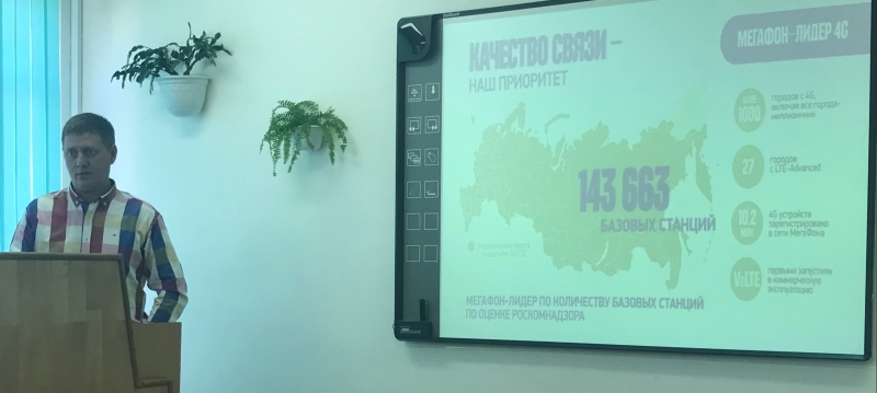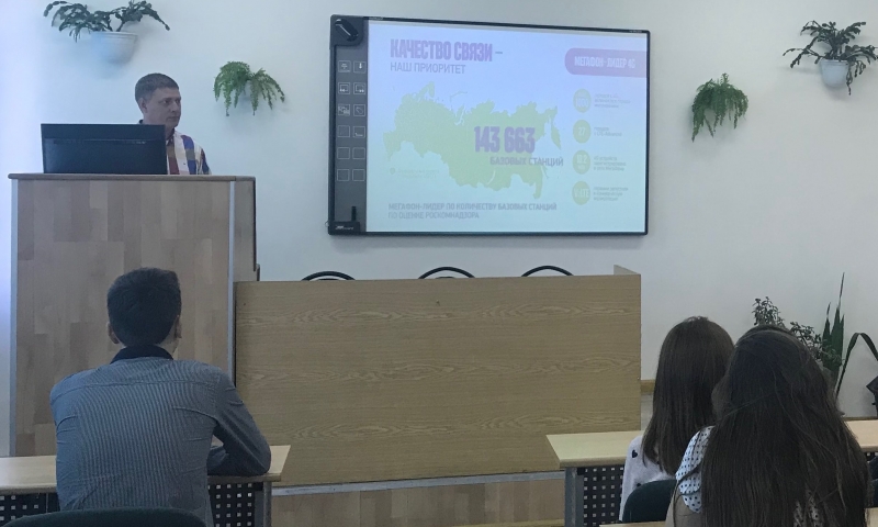 В начале своего выступления Михаил Николаевич познакомил студентов с деятельностью компании в современных конкурентных условиях и рассказал о том, что ПАО «МегаФон» занимает лидирующие позиции на рынке сотовой связи посредством введения в эксплуатацию огромного количества базовых станций, что обеспечивает достаточно стабильное функционирование мобильной связи и Интернет-провайдера сотового оператора «МегаФон». Кроме того, Перкун М.Н. говорил о расширении зоны покрытия сети «МегаФон» за счет освоения новых труднодоступных территорий, а также о преимуществах и недостатках данного мероприятия.