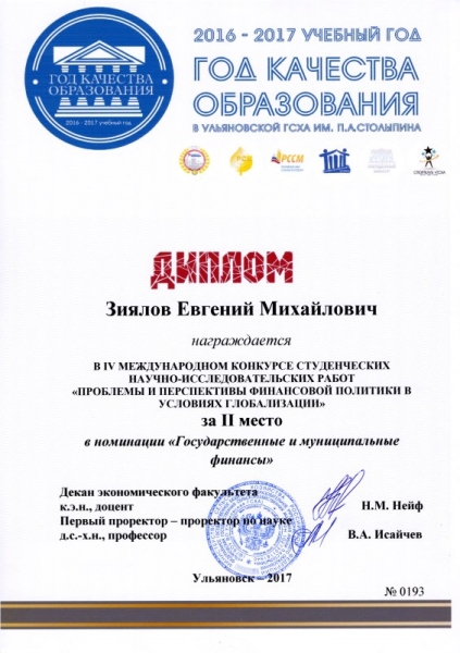 - 2nd year student Ziyalov Evgeniy - diploma of II degree in the nomination "State and municipal finance" (supervisor: associate professor Podkolzina I.M.);