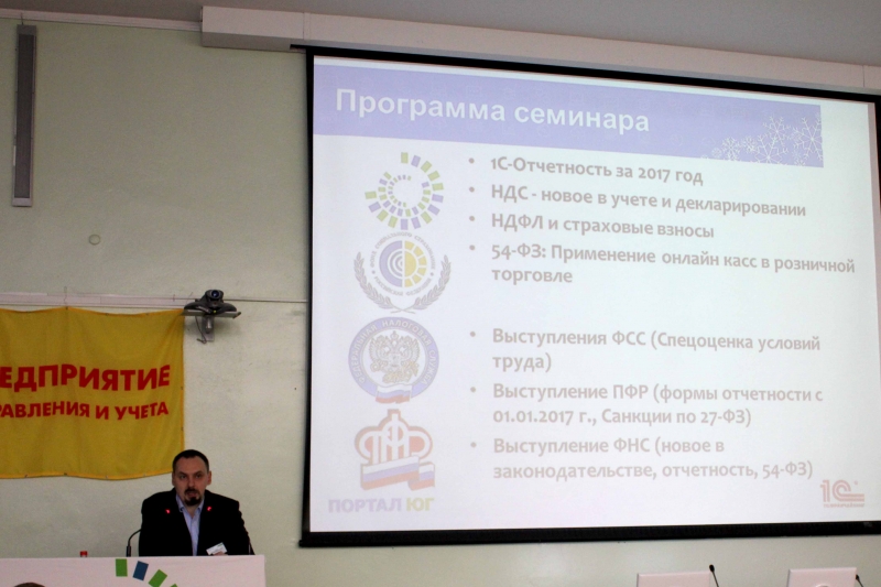 The program of the seminar, which took place on December 20, included speeches of the experts of the technology implementation department of 1C LLC Portal-Yug, as well as invited employees of the Tax Inspectorate and the Pension Fund.