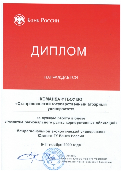 According to the results of a struggle, the team of the Stavropol State Agrarian University, consisting of 4th year students of the Accounting and Finance Faculty, specialty "Economic Security" Inal Efendiev, Viktor Mikhonenko, Alexander Yakovenko, Daria Dolmatova, Valeria Volkoderova, took an honorable second place, and was also awarded a special prize - a diploma for the best work in the block "Development of the regional corporate bond market".