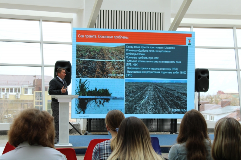 Then the floor was given to Vladimir Aleksandrovich Zelenko, Head of the Reclamation and Vegetable Growing Department of the Ministry of Agriculture of the Stavropol Territory, who provided information on the status of irrigated land in the Stavropol Territory. At the round table with interesting reports were made by Deputy Director for Production of Agroholding "Energomera" Artamonov Alexander, chief agronomist for maintaining technology "Dobrovolnoe" OOO, Krasnikov Alexander, chief agronomist of "Agrosahar" OOO, Izobilnensky district, Chernov Nikolai, agronomist of the irrigated area of "Urozhaynoye" OAO, Novoalexandrovsky district, who provided information on the characteristics of crop growing under irrigation. Presentations made by representatives of agricultural production during the round table aroused great interest and questions from the students. Direct communication with the producers is the key to success in the practical education of students.