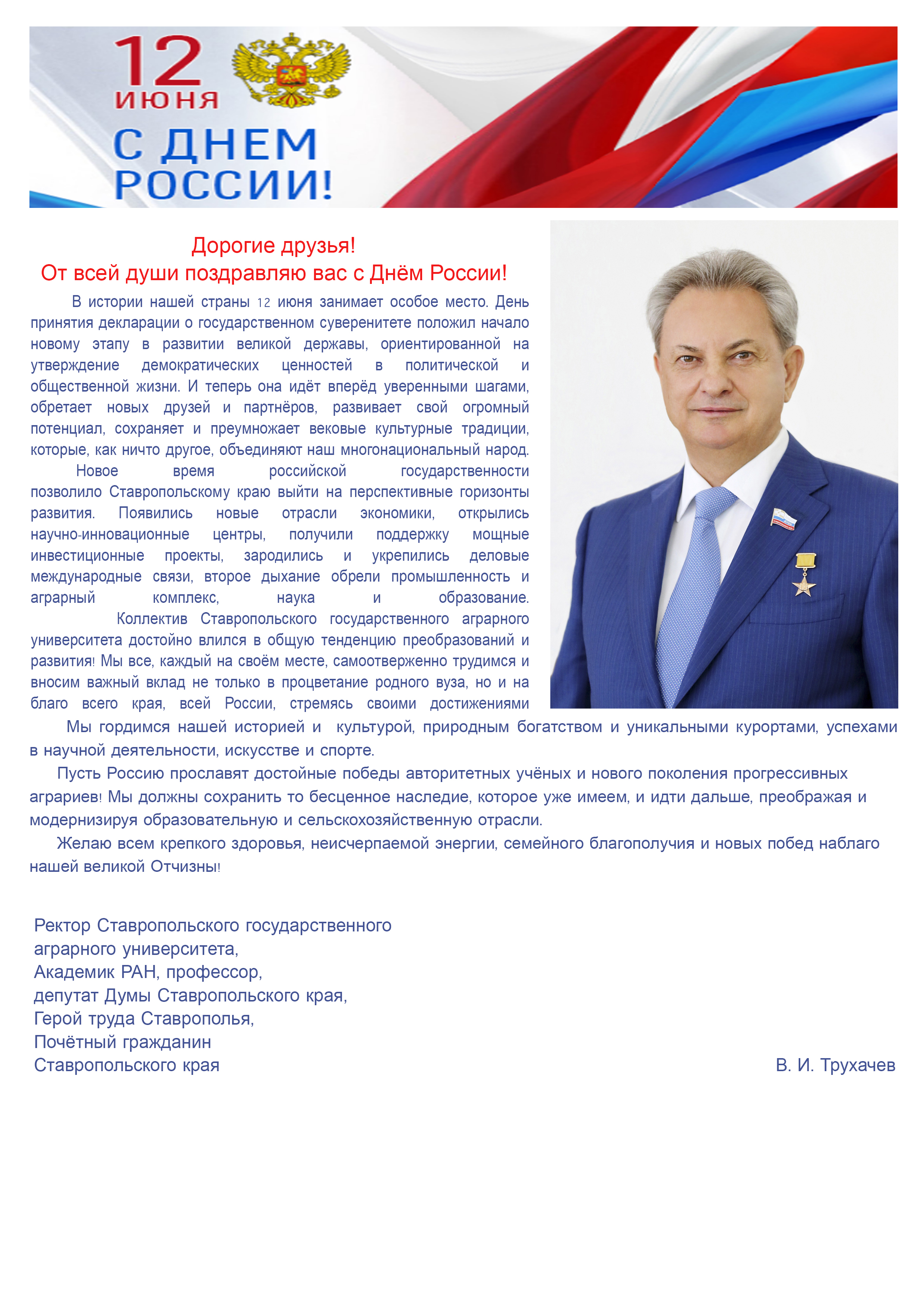 12 июня – День России Поздравление ректора Ставропольского государственного аграрного университета, Академика РАН, профессора, депутата Думы Ставропольского края, Героя труда Ставрополья, Почётного гражданина Ставропольского края В. И. Трухачева