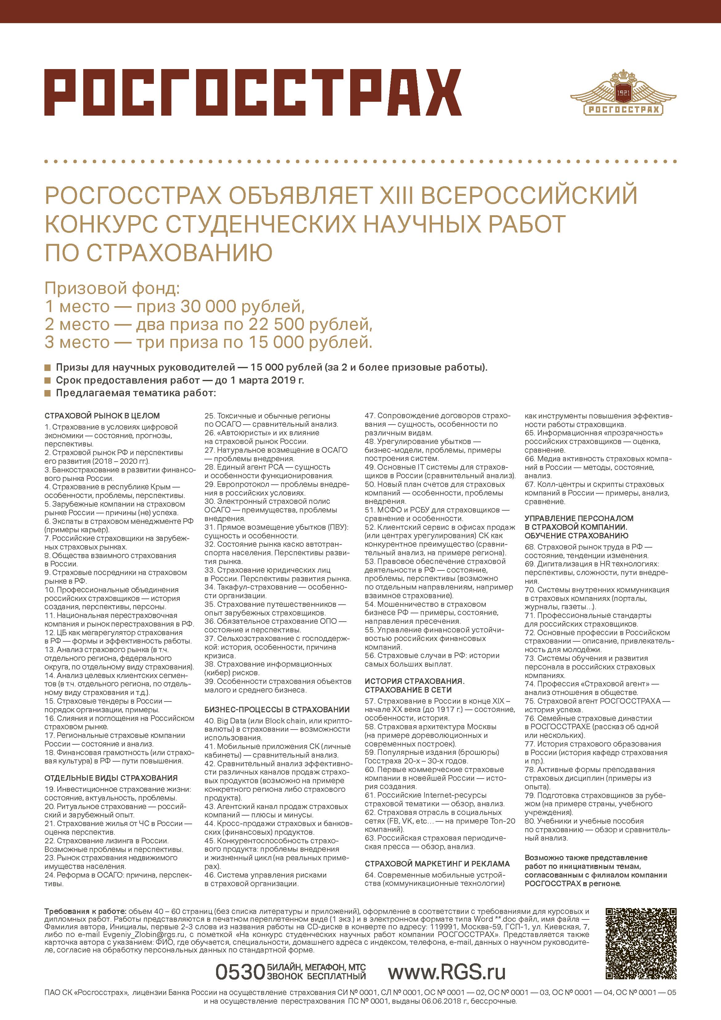 Перед началом нового учебного года крупнейший страховщик России объявляет о старте очередного XIII конкурса студенческих научных работ и рефератов на призы компании РОСГОССТРАХ. Этот конкурс давно стал самым массовым интеллектуальным состязанием в области страхования в нашей стране. К участию приглашаются студенты и преподаватели Ставропольского государственного аграрного университета.