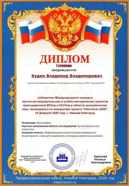 По итогам Международного конкурса научно-исследовательских и учебно-методических проектов преподавателей вузов и сузов, проводимого по инициативе «Interclover-2020» (г. Нижний Новгород.) монография «Информационно-аналитические возможности бухгалтерского учёта для управления устойчивым развитием экономики» удостоена диплома I степени.