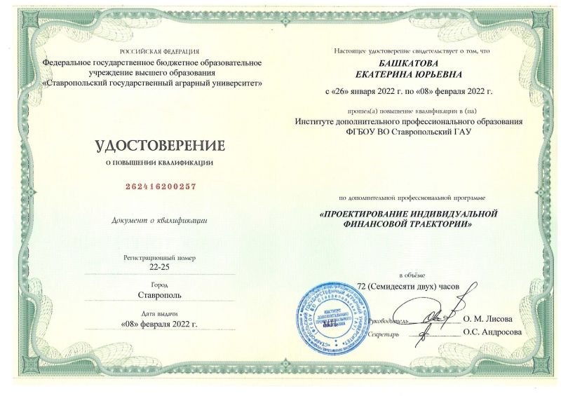 В рамках программы стратегического академического лидерства «Приоритет - 2030» реализована программа повышения квалификации по проекту АГРОКАДРЫ-2030 «Проектирование индивидуальной финансовой траектории». Цель программы - подготовка квалифицированных кадров, способных эффективно использовать финансовые инструменты по проектированию индивидуальной финансовой траектории; поддерживать устойчивое развитие и инвестиционную привлекательность бизнес – проектов в условиях цифровой трансформации.