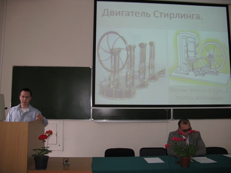 − «Действующая модель двигателя Стирлинга», разработанная студентом 2 курса агрономического факультета Никитой Мягких. Научный руководитель – доцент кафедры физики С. И. Любая.