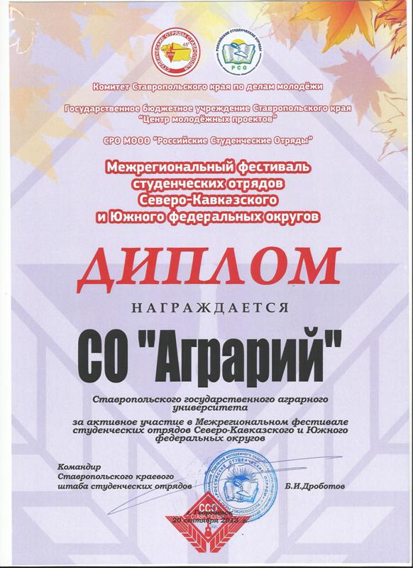Сводный студенческий отряд СтГАУ «Аграрий» принял участие в межрегиональном фестивале студенческих отрядов Северо-Кавказского и Южного федеральных округов. Он прошел 20 сентября 2013 г. на базе ГБОУ СПО «Георгиевский колледж». Все участники прошли курс обучения, а также приняли участие в спортивных соревнованиях между студенческими отрядами. По итогам фестиваля сводный отряд Ставропольского государственного аграрного университета «Аграрии» награжден дипломом за активное участие.