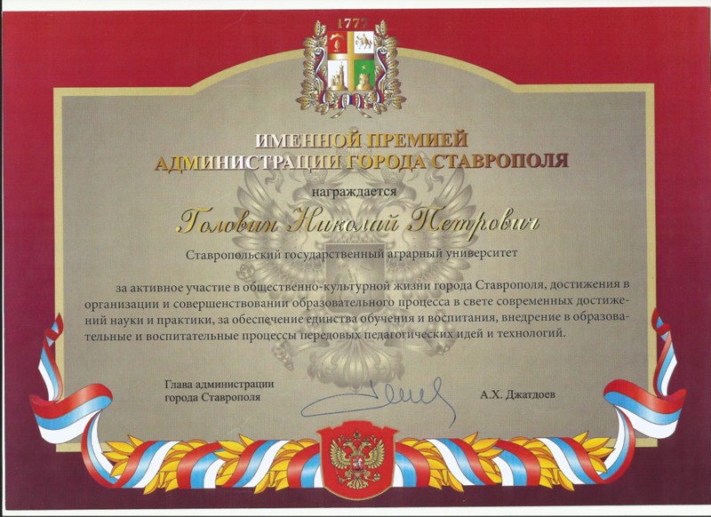 4 октября 2013 г. во Дворце детского творчества прошла торжественная церемония награждения именной стипендией администрации города Ставрополя. В числе тех, чьи заслуги были отмечены премией, и председатель студенческого профсоюзного комитета Ставропольского государственного аграрного университета Николай Головин. Глава администрации Ставрополя А. Х. Джатдоев вручил ему премию за активное участие в общественно-культурной жизни города Ставрополя, достижения в организации и совершенствовании образовательного процесса в свете современных достижений науки и практики, обеспечение единства обучения и воспитания, внедрения в образовательные и воспитательные процессы передовых педагогических идей и технологий.