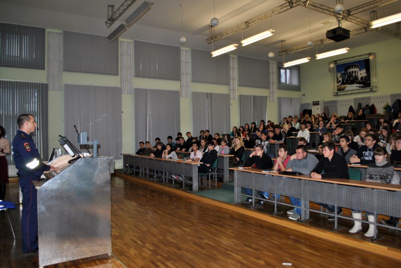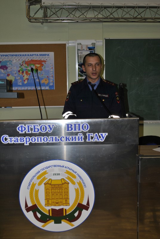28 ноября 2013 г. студенты учетно-финансового факультета и факультета механизации сельского хозяйства приняли участие во встрече с инспектором группы по пропаганде ОБ ДПС ОГИБОДИ Управления МВД России по г. Ставрополю Сердюковым Сергеем Владимировичем. Он рассказал студентам о правилах дорожного движения, видах административного и уголовного наказаниях и показал видеоролик.