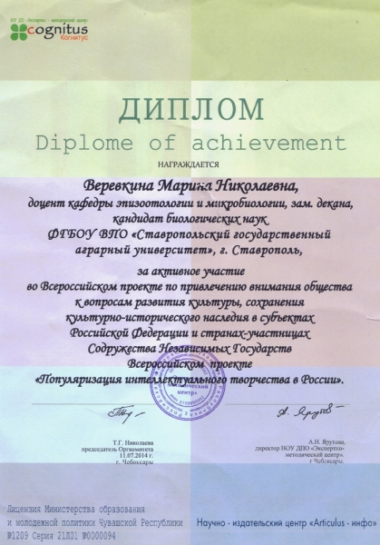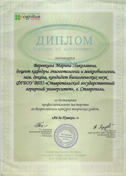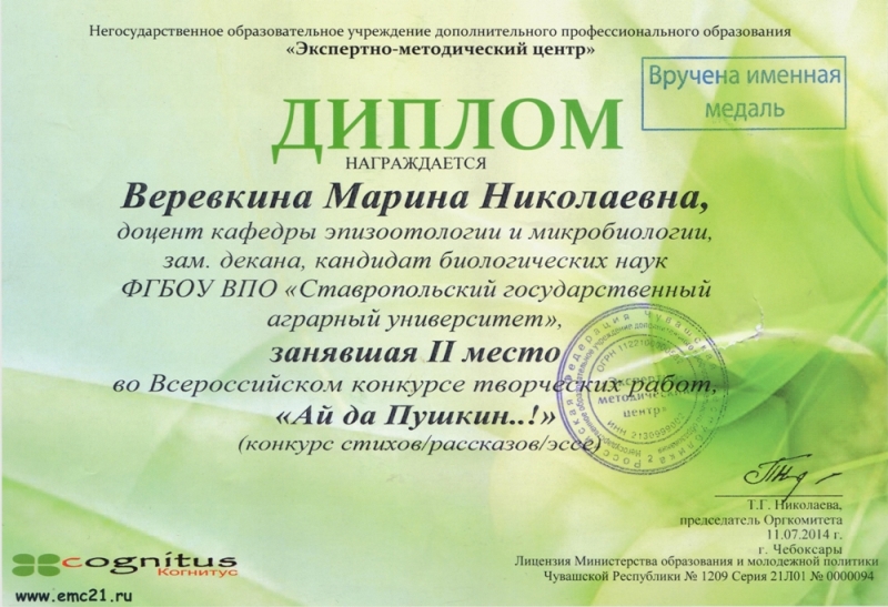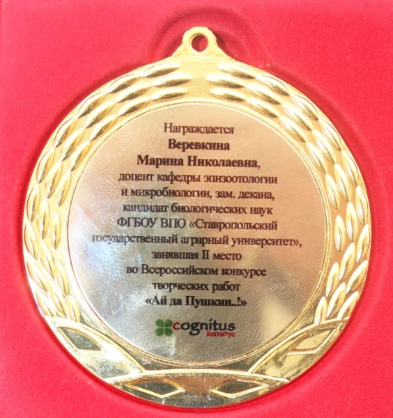 Из Ставропольского края участие в этом конкурсе приняла Марина Николаевна Верёвкина, доцент Ставропольского государственного аграрного университета кафедры эпизоотологии и микробиологии факультета ветеринарной медицины. Она из скромности и критического отношения к себе никому, кроме близких, не рассказывала о своём увлечении, о том, что когда ей особенно трудно, у неё рождаются стихи. И такие, что по итогам конкурса компетентное жюри присудило ей 2 место в номинации «эссе/стихи/рассказы», вручив именную медаль и диплом победителя! Марина Николаевна, мы от души поздравляем Вас, рады, что в нашем университете работают такие творческие преподаватели, люди с тонкой душой! Успехов Вам!