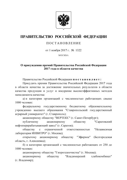 According the decree of the government of the Russian Federation from November 1, 2017 No. 1322 in 2017 award for achievement of high results in quality of products and services and introduction of highly effective methods of quality management awarded by 10 Russian organizations. Stavropol State Agrarian University became the only Russian universities to be awarded such a high award for the third time!