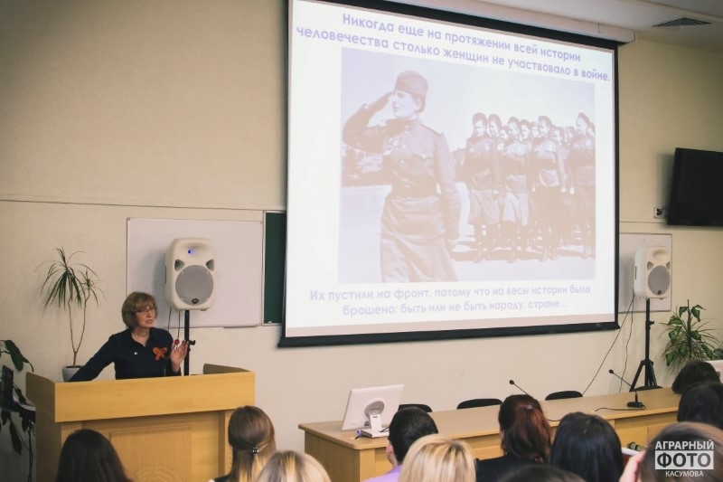 Marina Vasilievna Obnovlenskaya, director of the University's Scientific Library, continued the lesson of courage. Speaking to students and teachers with the report "The war does not have a woman's face" she told about the life and heroic deeds of women at the front and in the rear in wartime.